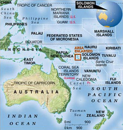 Nearly one thousand islands covering about 80,000 square kilometres make the Solomon Islands the third largest archipelago in the South Pacific, covering an area between 5 and 12 degrees south of the equator. Its average temperature is 29C. Of its population of around 600,000, only 120,000 live and work in an urban environment, most remain within a subsistence economy.